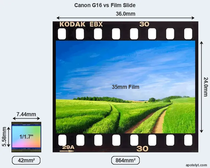 With a crop factor of 4.65, the sensor in the Canon G16 is smaller than the receptor area of a 35mm film slide or negative. As a result, the lens that is attached to the Canon G16 will offer a narrower angle of view and provide deeper depth of field than a lens of similar focal length and aperture on a film camera. The equivalent focal length is obtained by multiplying the actual focal length of the lens with the crop factor. For example, a 11mm lens on the Canon G16 will provide the same angle of view and depth of field as a 50mm normal lens on a film camera (11mm * 4.65 = 50mm).
