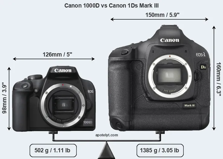 If the front view area (width x height) of the cameras is taken as an aggregate measure of their size, the Canon 1Ds Mark III is considerably larger (94 percent) than the Canon 1000D. Moreover, the 1Ds Mark III is substantially heavier (176 percent) than the 1000D. It is noteworthy in this context that the 1Ds Mark III is splash and dust-proof, while the 1000D does not feature any corresponding weather-sealing.
