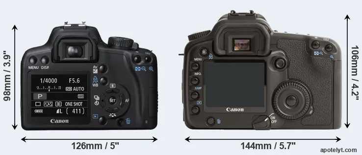 An illustration of the physical size and weight of the Canon 1000D and the Canon 30D is provided in the side-by-side display below. The two cameras are presented according to their relative size. Three consecutive views from the front, the top, and the rear side are shown. All size dimensions are rounded to the nearest millimeter.