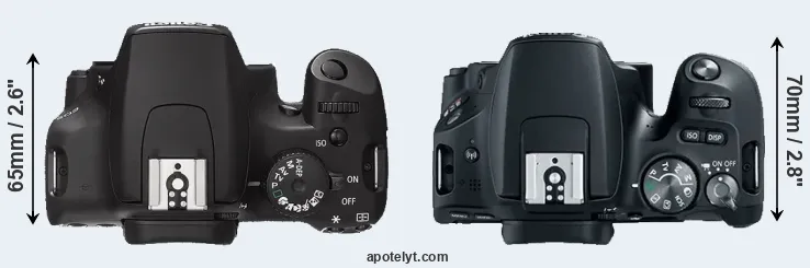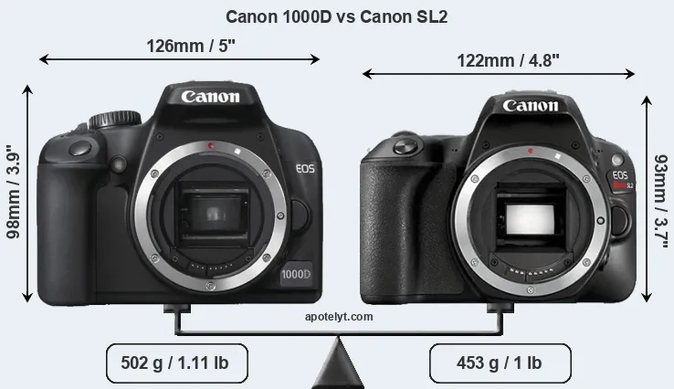 The side-by-side display below illustrates the physical size and weight of the Canon 1000D and the Canon SL2. The two cameras are presented according to their relative size. Three consecutive perspectives from the front, the top, and the back are available. All width, height and depth measures are rounded to the nearest millimeter.