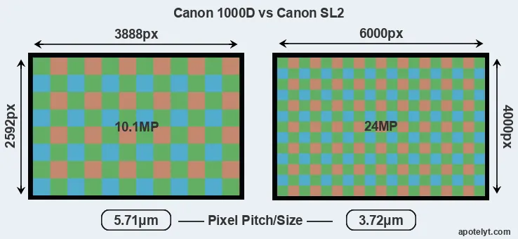 With 24MP, the SL2 offers a higher resolution than the 1000D (10.1MP), but the SL2 has smaller individual pixels (pixel pitch of 3.72μm versus 5.71μm for the 1000D). Yet, the SL2 is a much more recent model (by 9 years) than the 1000D, and its sensor will have benefitted from technological advances during this time that enhance the light gathering capacity of its pixel-units.