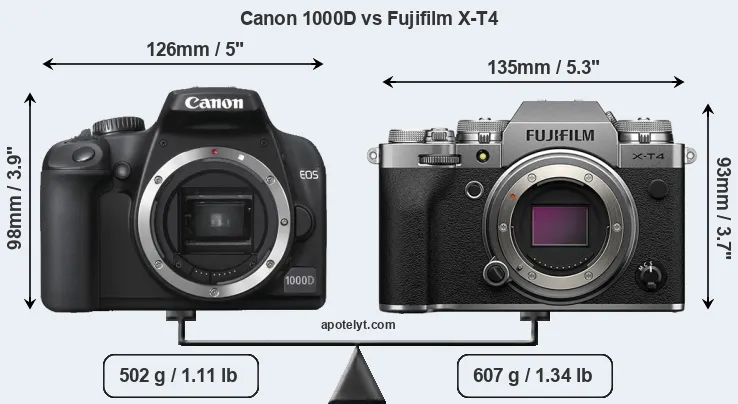 The side-by-side display below illustrates the physical size and weight of the Canon 1000D and the Fujifilm X-T4. The two cameras are presented according to their relative size. Three consecutive views from the front, the top, and the rear side are shown. All width, height and depth dimensions are rounded to the nearest millimeter.