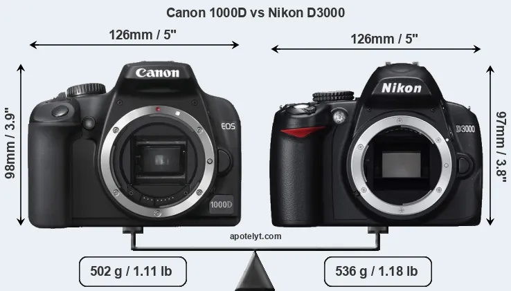 An illustration of the physical size and weight of the Canon 1000D and the Nikon D3000 is provided in the side-by-side display below. The two cameras are presented according to their relative size. Three consecutive views from the front, the top, and the rear side are shown. All width, height and depth measures are rounded to the nearest millimeter.
