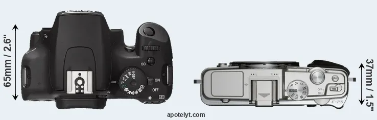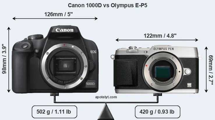 The physical size and weight of the Canon 1000D and the Olympus E-P5 are illustrated in the side-by-side display below. The two cameras are presented according to their relative size. Three consecutive perspectives from the front, the top, and the back are available. All width, height and depth measures are rounded to the nearest millimeter.