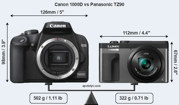 The physical size and weight of the Canon 1000D and the Panasonic TZ90 are illustrated in the side-by-side display below. The two cameras are presented according to their relative size. Three successive views from the front, the top, and the rear are shown. All width, height and depth measures are rounded to the nearest millimeter.