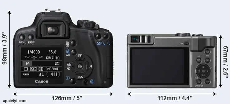 The above size and weight comparisons are to some extent incomplete and possibly misleading, as the TZ90 has a lens built in, whereas the 1000D is an interchangeable lens camera that requires a separate lens. Attaching the latter will add extra weight and bulk to the setup. You can compare the optics available for the 1000D and their specifications in the Canon EF Lens Catalog.