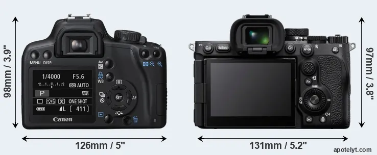 Going beyond this snapshot of core features and characteristics, what are the differences between the Canon EOS 1000D and the Sony Alpha A7R V? Which one should you buy? Read on to find out how these two cameras compare with respect to their body size, their imaging sensors, their shooting features, their input-output connections, and their reception by expert reviewers.