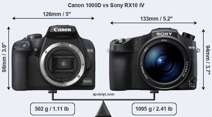 The side-by-side display below illustrates the physical size and weight of the Canon 1000D and the Sony RX10 IV. The two cameras are presented according to their relative size. Three consecutive perspectives from the front, the top, and the back are available. All width, height and depth dimensions are rounded to the nearest millimeter.
