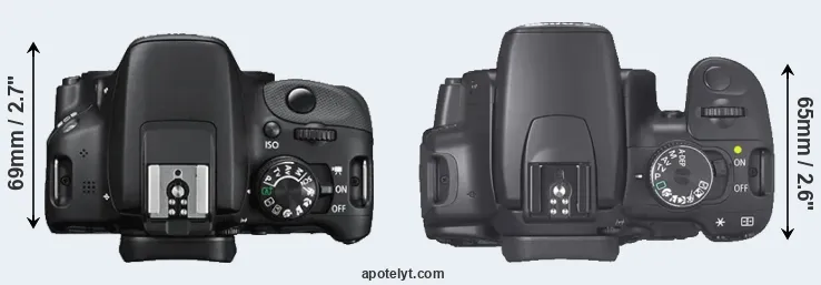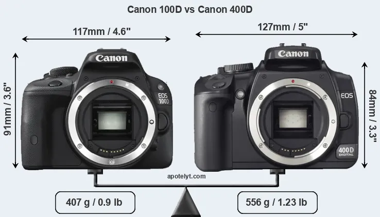 The side-by-side display below illustrates the physical size and weight of the Canon 100D and the Canon 400D. The two cameras are presented according to their relative size. Three consecutive perspectives from the front, the top, and the back are available. All width, height and depth measures are rounded to the nearest millimeter.