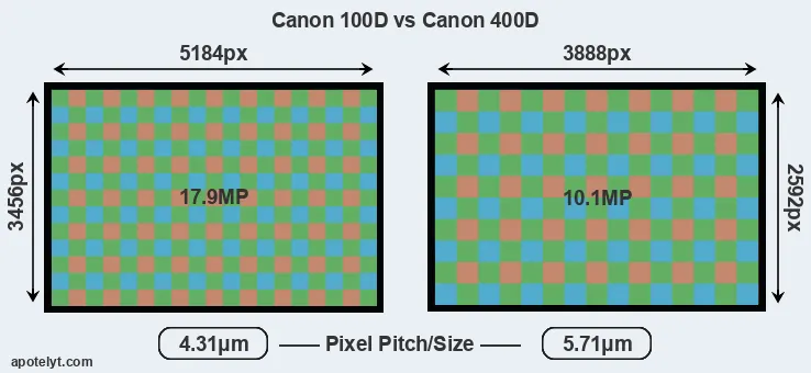 With 17.9MP, the 100D offers a higher resolution than the 400D (10.1MP), but the 100D has smaller individual pixels (pixel pitch of 4.31μm versus 5.71μm for the 400D). However, the 100D is a much more recent model (by 6 years and 6 months) than the 400D, and its sensor will have benefitted from technological advances during this time that enhance the light gathering capacity of its pixels.