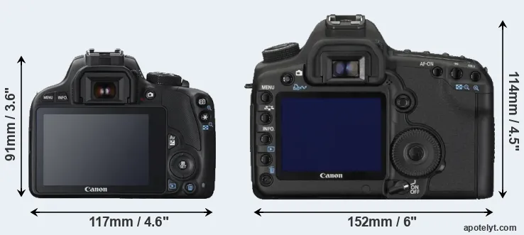 An illustration of the physical size and weight of the Canon 100D and the Canon 5D Mark II is provided in the side-by-side display below. The two cameras are presented according to their relative size. Three successive views from the front, the top, and the rear are shown. All width, height and depth measures are rounded to the nearest millimeter.