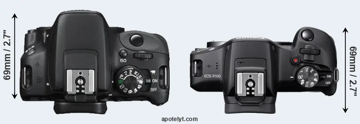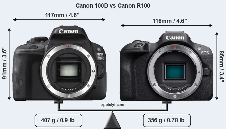 The physical size and weight of the Canon 100D and the Canon R100 are illustrated in the side-by-side display below. The two cameras are presented according to their relative size. Three consecutive perspectives from the front, the top, and the back are available. All width, height and depth dimensions are rounded to the nearest millimeter.