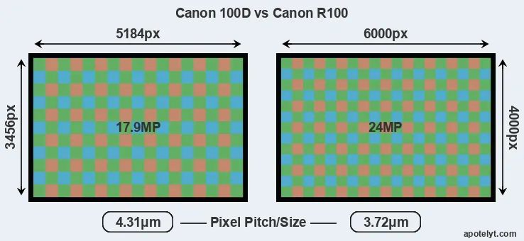 While the two cameras under review share the same sensor size, the R100 offers a higher resolution of 24 megapixels, compared with 17.9 MP of the 100D. This megapixels advantage translates into a 16 percent gain in linear resolution. On the other hand, these sensor specs imply that the R100 has a higher pixel density and a smaller size of the individual pixel (with a pixel pitch of 3.72μm versus 4.31μm for the 100D). However, it should be noted that the R100 is much more recent (by 10 years and 2 months) than the 100D, and its sensor will have benefitted from technological advances during this time that compensate for the smaller pixel size. Coming back to sensor resolution, it should be mentioned that the R100 has no anti-alias filter installed, so that it can capture all the detail its sensor resolves.