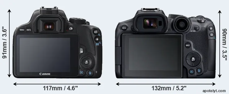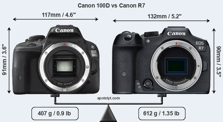 If the front view area (width x height) of the cameras is taken as an aggregate measure of their size, the Canon R7 is notably larger (12 percent) than the Canon 100D. Moreover, the R7 is substantially heavier (50 percent) than the 100D. It is noteworthy in this context that the R7 is splash and dust-proof, while the 100D does not feature any corresponding weather-sealing.