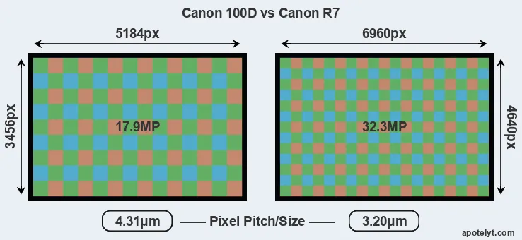 Despite having a slightly smaller sensor, the R7 offers a higher resolution of 32.3 megapixels, compared with 17.9 MP of the 100D. This megapixels advantage comes at the cost of a higher pixel density and a smaller size of the individual pixel (with a pixel pitch of 3.20μm versus 4.31μm for the 100D). However, it should be noted that the R7 is much more recent (by 9 years and 2 months) than the 100D, and its sensor will have benefitted from technological advances during this time that make it possible to gather light more efficiently.
