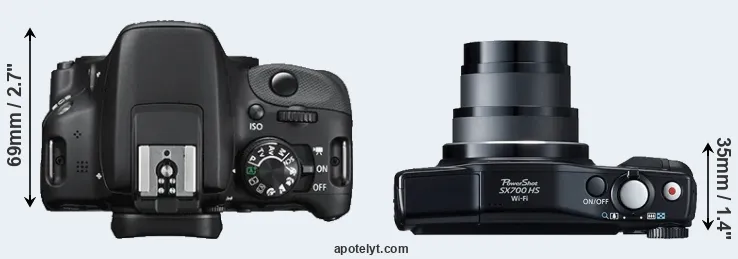 The side-by-side display below illustrates the physical size and weight of the Canon 100D and the Canon SX700. The two cameras are presented according to their relative size. Three successive views from the front, the top, and the rear are shown. All width, height and depth measures are rounded to the nearest millimeter.