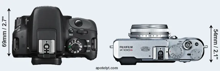 An illustration of the physical size and weight of the Canon 100D and the Fujifilm X100S is provided in the side-by-side display below. The two cameras are presented according to their relative size. Three consecutive perspectives from the front, the top, and the back are available. All width, height and depth dimensions are rounded to the nearest millimeter.