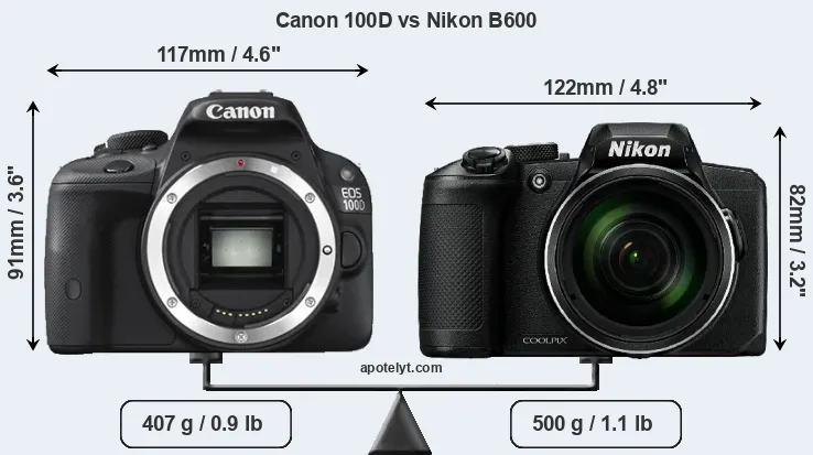 An illustration of the physical size and weight of the Canon 100D and the Nikon B600 is provided in the side-by-side display below. The two cameras are presented according to their relative size. Three successive views from the front, the top, and the rear are shown. All width, height and depth measures are rounded to the nearest millimeter.