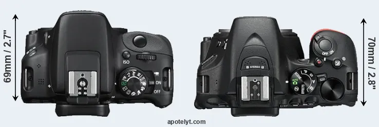The side-by-side display below illustrates the physical size and weight of the Canon 100D and the Nikon D5500. The two cameras are presented according to their relative size. Three successive views from the front, the top, and the rear are shown. All width, height and depth dimensions are rounded to the nearest millimeter.