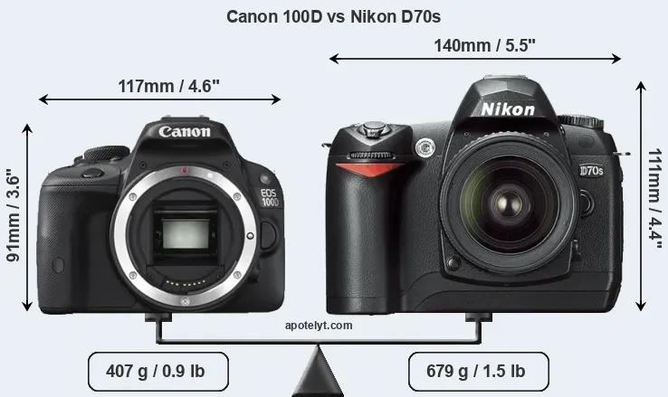 The physical size and weight of the Canon 100D and the Nikon D70s are illustrated in the side-by-side display below. The two cameras are presented according to their relative size. Three consecutive views from the front, the top, and the rear side are shown. All size dimensions are rounded to the nearest millimeter.