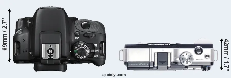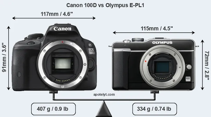 The side-by-side display below illustrates the physical size and weight of the Canon 100D and the Olympus E-PL1. The two cameras are presented according to their relative size. Three consecutive perspectives from the front, the top, and the back are available. All width, height and depth measures are rounded to the nearest millimeter.