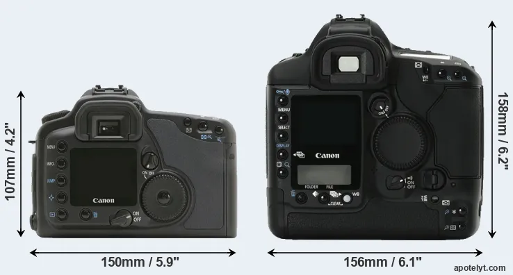 | 4. | Canon 1Ds | 156 mm | 158 mm | 80 mm | 1265 g | 600 | Y | Sep 2002 | US$ 8 999 | ebay.com | |