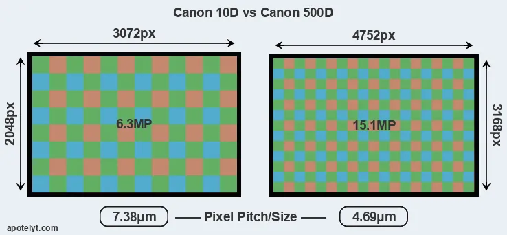 Despite having a slightly smaller sensor, the 500D offers a higher resolution of 15.1 megapixels, compared with 6.3 MP of the 10D. This megapixels advantage comes at the cost of a higher pixel density and a smaller size of the individual pixel (with a pixel pitch of 4.69μm versus 7.38μm for the 10D). However, it should be noted that the 500D is much more recent (by 6 years) than the 10D, and its sensor will have benefitted from technological advances during this time that make it possible to gather light more efficiently.