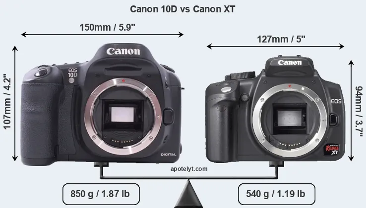 An illustration of the physical size and weight of the Canon 10D and the Canon XT is provided in the side-by-side display below. The two cameras are presented according to their relative size. Three successive views from the front, the top, and the rear are shown. All width, height and depth dimensions are rounded to the nearest millimeter.