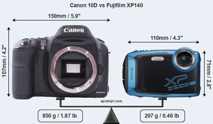 If the front view area (width x height) of the cameras is taken as an aggregate measure of their size, the Fujifilm XP140 is considerably smaller (51 percent) than the Canon 10D. It is noteworthy in this context that the XP140 is splash and dust-proof, while the 10D does not feature any corresponding weather-sealing. More than that, the XP140 is water-proof up to 25m and can, thus, be used for underwater photography.