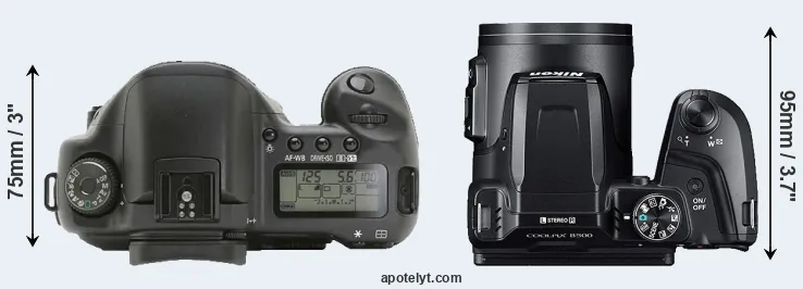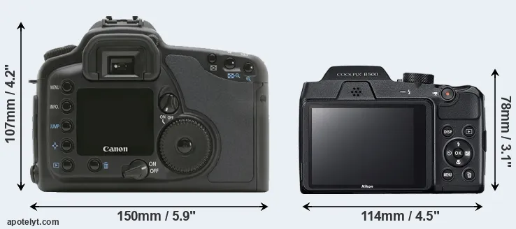 Going beyond this snapshot of core features and characteristics, what are the differences between the Canon EOS 10D and the Nikon Coolpix B500? Which one should you buy? Read on to find out how these two cameras compare with respect to their body size, their imaging sensors, their shooting features, their input-output connections, and their reception by expert reviewers.