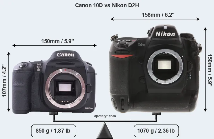If the front view area (width x height) of the cameras is taken as an aggregate measure of their size, the Nikon D2H is considerably larger (48 percent) than the Canon 10D. Moreover, the D2H is markedly heavier (26 percent) than the 10D. It is noteworthy in this context that the D2H is splash and dust-proof, while the 10D does not feature any corresponding weather-sealing.