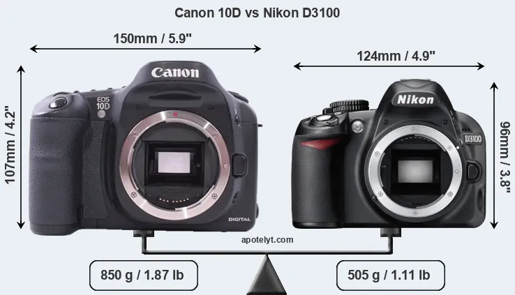 The side-by-side display below illustrates the physical size and weight of the Canon 10D and the Nikon D3100. The two cameras are presented according to their relative size. Three successive views from the front, the top, and the rear are shown. All size dimensions are rounded to the nearest millimeter.