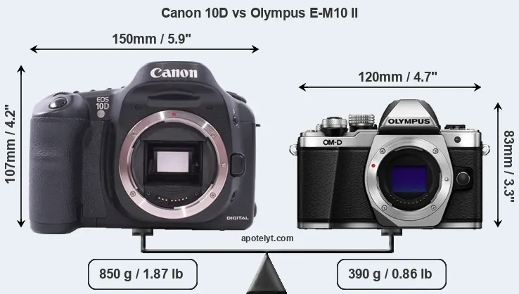 An illustration of the physical size and weight of the Canon 10D and the Olympus E-M10 II is provided in the side-by-side display below. The two cameras are presented according to their relative size. Three consecutive perspectives from the front, the top, and the back are available. All size dimensions are rounded to the nearest millimeter.