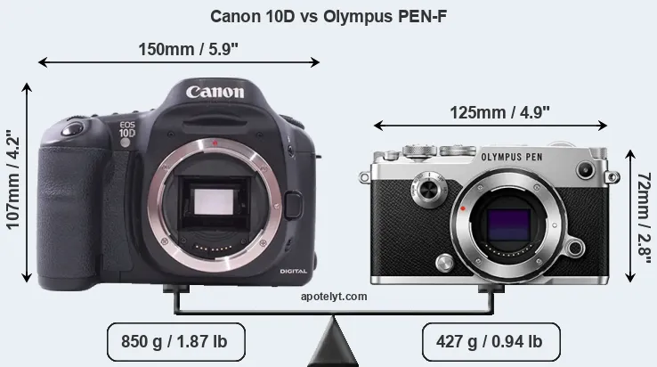 If the front view area (width x height) of the cameras is taken as an aggregate measure of their size, the Olympus PEN-F is considerably smaller (44 percent) than the Canon 10D. Moreover, the PEN-F is substantially lighter (50 percent) than the 10D. In this context, it is worth noting that neither the 10D nor the PEN-F are weather-sealed.