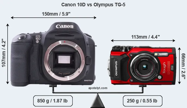An illustration of the physical size and weight of the Canon 10D and the Olympus TG-5 is provided in the side-by-side display below. The two cameras are presented according to their relative size. Three consecutive views from the front, the top, and the rear side are shown. All width, height and depth dimensions are rounded to the nearest millimeter.