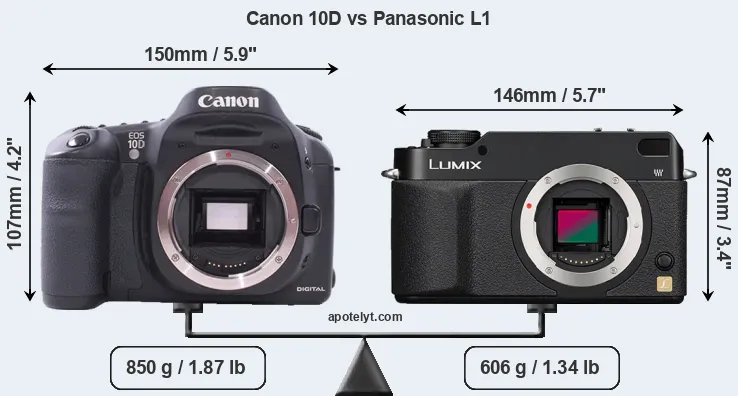 If the front view area (width x height) of the cameras is taken as an aggregate measure of their size, the Panasonic L1 is notably smaller (21 percent) than the Canon 10D. Moreover, the L1 is markedly lighter (29 percent) than the 10D. In this context, it is worth noting that neither the 10D nor the L1 are weather-sealed.
