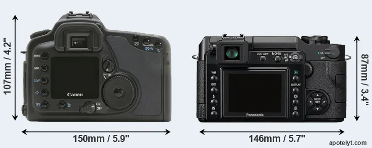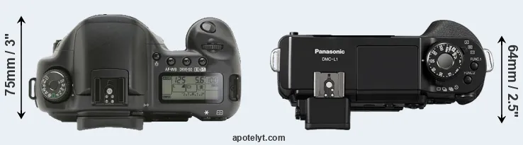 The side-by-side display below illustrates the physical size and weight of the Canon 10D and the Panasonic L1. The two cameras are presented according to their relative size. Three successive views from the front, the top, and the rear are shown. All size dimensions are rounded to the nearest millimeter.