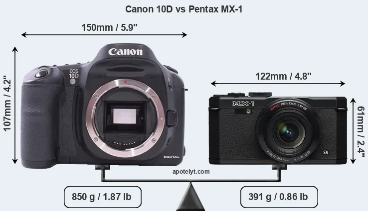 The physical size and weight of the Canon 10D and the Pentax MX-1 are illustrated in the side-by-side display below. The two cameras are presented according to their relative size. Three consecutive perspectives from the front, the top, and the back are available. All size dimensions are rounded to the nearest millimeter.