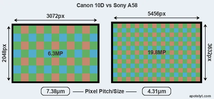 With 19.8MP, the A58 offers a higher resolution than the 10D (6.3MP), but the A58 has smaller individual pixels (pixel pitch of 4.31μm versus 7.38μm for the 10D). Yet, the A58 is a much more recent model (by 9 years and 11 months) than the 10D, and its sensor will have benefitted from technological advances during this time that enhance the light gathering capacity of its pixel-units.