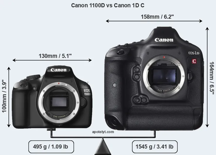 The physical size and weight of the Canon 1100D and the Canon 1D C are illustrated in the side-by-side display below. The two cameras are presented according to their relative size. Three successive views from the front, the top, and the rear are shown. All width, height and depth measures are rounded to the nearest millimeter.
