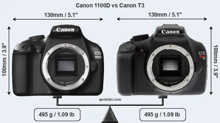 In this particular case, the Canon 1100D and the Canon T3 have exactly the same width and height, and, thus, have identically-sized bodies. Moreover, the two cameras also share the same weight. In this context, it is worth noting that neither the 1100D nor the T3 are weather-sealed.