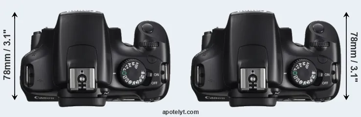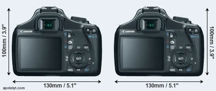 The side-by-side display below illustrates the physical size and weight of the Canon 1100D and the Canon T3. The two cameras are presented according to their relative size. Three consecutive perspectives from the front, the top, and the back are available. All width, height and depth dimensions are rounded to the nearest millimeter.