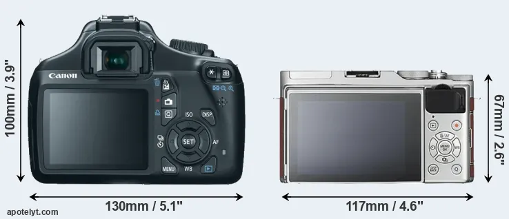 The physical size and weight of the Canon 1100D and the Fujifilm X-A3 are illustrated in the side-by-side display below. The two cameras are presented according to their relative size. Three consecutive perspectives from the front, the top, and the back are available. All width, height and depth dimensions are rounded to the nearest millimeter.
