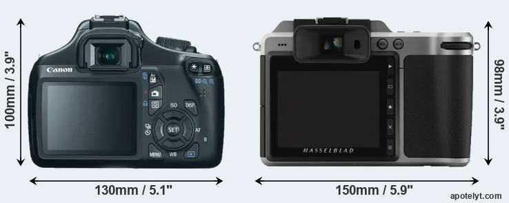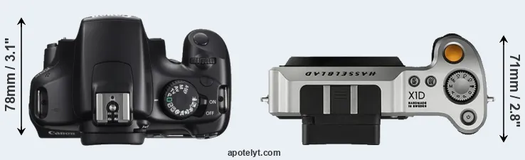 The physical size and weight of the Canon 1100D and the Hasselblad X1D are illustrated in the side-by-side display below. The two cameras are presented according to their relative size. Three successive views from the front, the top, and the rear are shown. All width, height and depth measures are rounded to the nearest millimeter.