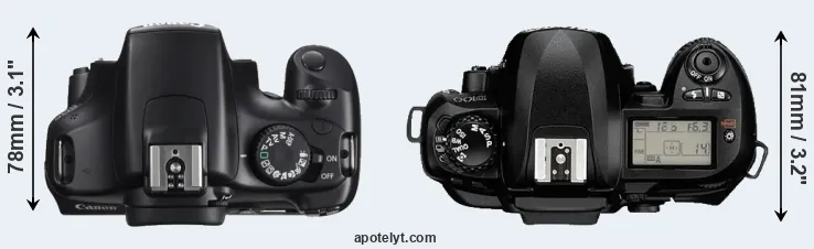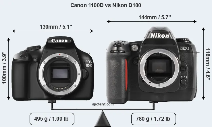 The side-by-side display below illustrates the physical size and weight of the Canon 1100D and the Nikon D100. The two cameras are presented according to their relative size. Three consecutive perspectives from the front, the top, and the back are available. All size dimensions are rounded to the nearest millimeter.