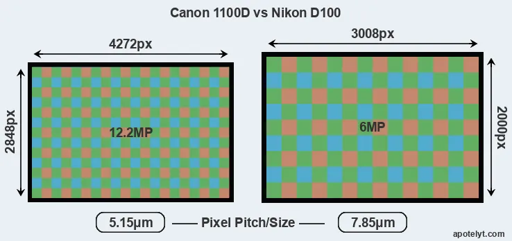 Despite having a smaller sensor, the Canon 1100D offers a higher resolution of 12.2 megapixels, compared with 6 MP of the Nikon D100. This megapixels advantage comes at the cost of a higher pixel density and a smaller size of the individual pixel (with a pixel pitch of 5.15μm versus 7.85μm for the D100). However, it should be noted that the 1100D is much more recent (by 8 years and 11 months) than the D100, and its sensor will have benefitted from technological advances during this time that make it possible to gather light more efficiently.