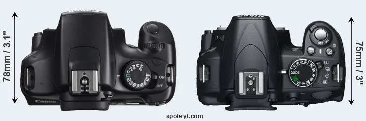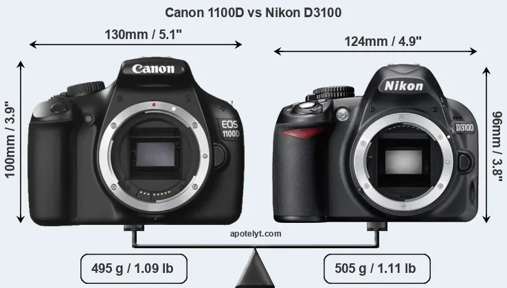 An illustration of the physical size and weight of the Canon 1100D and the Nikon D3100 is provided in the side-by-side display below. The two cameras are presented according to their relative size. Three successive views from the front, the top, and the rear are shown. All width, height and depth dimensions are rounded to the nearest millimeter.