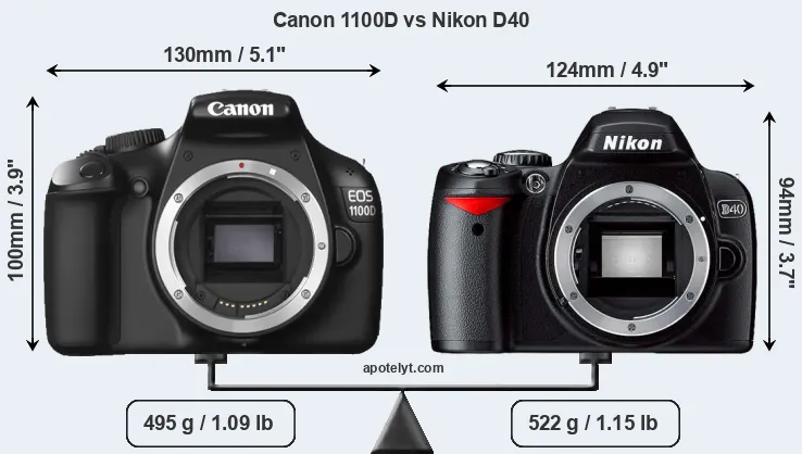 An illustration of the physical size and weight of the Canon 1100D and the Nikon D40 is provided in the side-by-side display below. The two cameras are presented according to their relative size. Three successive views from the front, the top, and the rear are shown. All width, height and depth dimensions are rounded to the nearest millimeter.