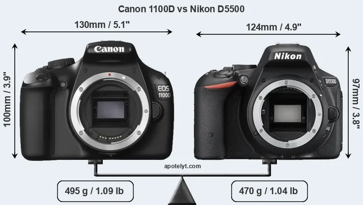The physical size and weight of the Canon 1100D and the Nikon D5500 are illustrated in the side-by-side display below. The two cameras are presented according to their relative size. Three successive views from the front, the top, and the rear are shown. All width, height and depth measures are rounded to the nearest millimeter.