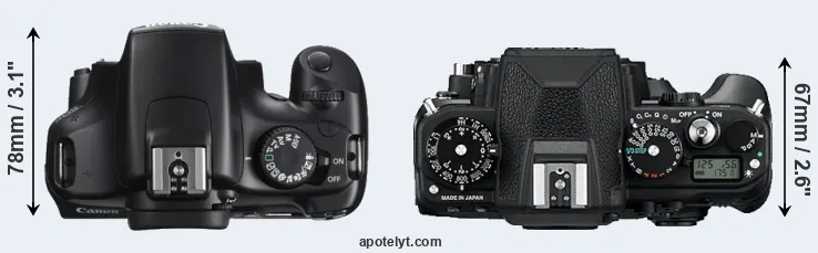 The physical size and weight of the Canon 1100D and the Nikon Df are illustrated in the side-by-side display below. The two cameras are presented according to their relative size. Three successive views from the front, the top, and the rear are shown. All width, height and depth dimensions are rounded to the nearest millimeter.